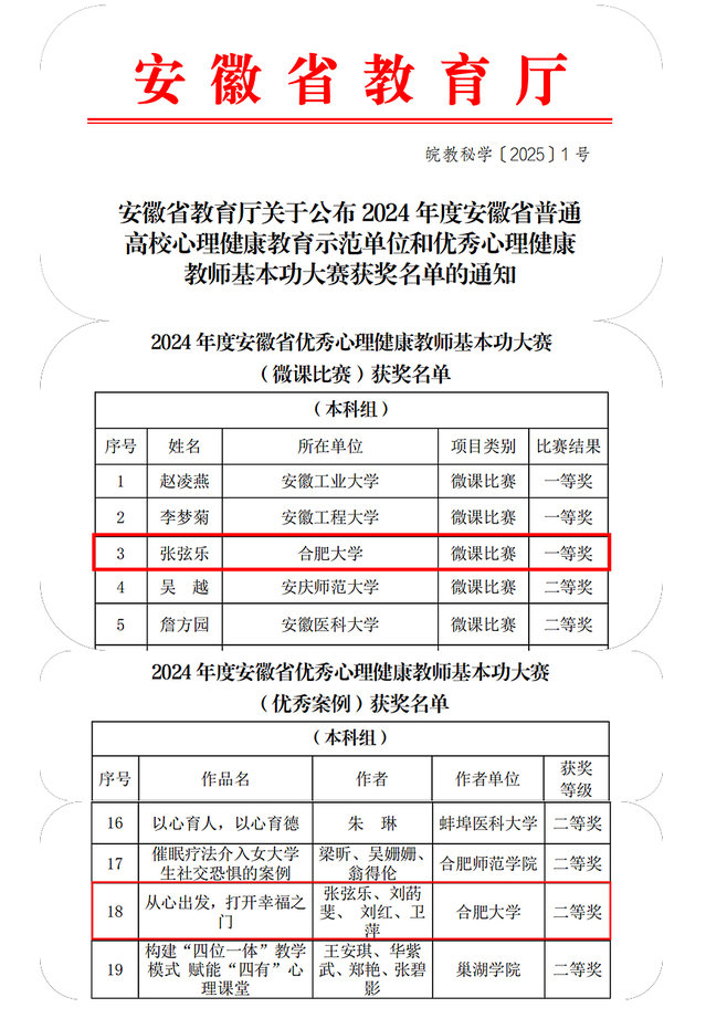 近日,從省教育廳傳來消息,我院教師張弦樂在2024 年度安徽省普通高校優(yōu)秀心理健康教師基本功大賽中榮獲本科組微課比賽一等獎、優(yōu)秀案例競賽本科組二等獎。