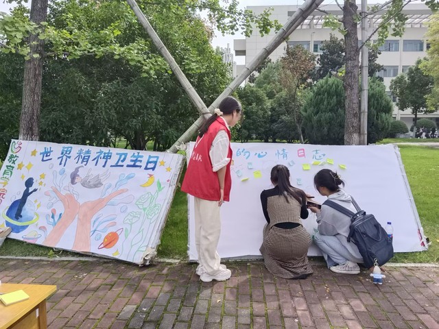 世界精神衛生日是每年的10月10日,精神衛生是指一種健康狀態,在這種狀態中,每個人都能夠認識到自身潛力,能夠適應正常的生活壓力,能夠有成效地工作,并能夠為其居住的社區做出貢獻。本次活動主要分為制作心情顏色畫板、分發心理趣味小知識便條、心情盲盒活動以及張貼煩惱便簽四個部分。活動的第一天主要開展制作心情畫板和分發心理小知識兩個活動,用綠色、黃色、紅色和黑色分別代表開心、無聊、生氣和憂郁的心情。志愿者們引導同學們選擇對應顏色的畫筆來分享自己今天的心情,可以采取寫字或者畫畫的方式。之后志愿者為同學們分發心理知識便簽,讓更多的同學了解心理健康知識。第二天主要開展后兩個部分,同學們可以在便簽上寫下自己的煩惱再貼在展板上,隨后在心情盲盒中抽取一張寫有鼓勵話語的便簽并寫下一張正能量的話投入盲盒中,讓溫暖往下傳遞。