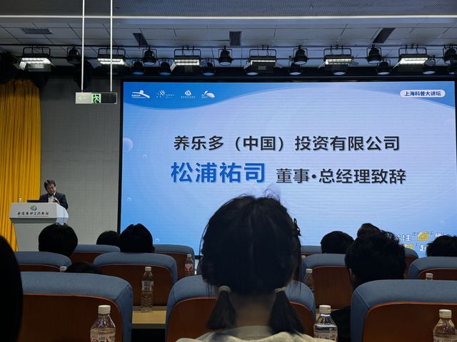 方波館長的開場詞高屋建瓴,強調了科普對于食品領域的重要性,為接下來的精彩內容奠定了基礎。隨后,養樂多中國投資有限公司的松浦祐司董事總經理登臺致辭。松浦祐司董事總經理詳細地向同學們介紹了養樂多里面益生菌的好處,讓同學們對益生菌的作用有了更深入的了解。他的講解生動形象,結合實際案例,使同學們深刻認識到益生菌在維護人體健康方面的重要價值。緊接著,上海科普教育發展基金會袁正宏副理事長致辭。袁正宏副理事長從科普教育的角度出發,闡述了舉辦此次食品專題報告會的意義,鼓勵同學們積極參與科普活動,提高自身科學素養。