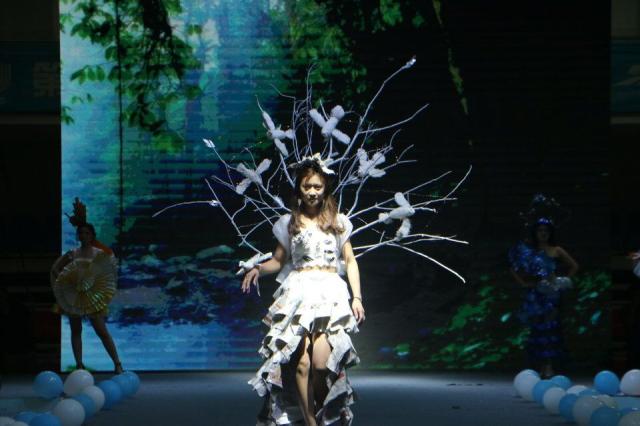 比賽伊始,活動現場播放了來自各大高校的祝福視頻。隨后,13個系的模特代表便依次為觀眾呈現了一場絢麗繽紛的開場秀表演,比賽正式拉開帷幕。第一個上場的機械系模特隊伍,設計師們以綠色為主色調,與當下季節相襯,給人視覺上的清爽,贏得了在場觀眾的歡呼。而外語系則以童話故事為背景,最引人注目的是一位守護著原始部落的自由女神,身著以廢舊光盤為主要原料、通過紙片和舊報紙的分割重組形成一個全新的服裝造型,突出了綠色環保、大膽創新的服裝設計原則,富有跳躍感而又不失沉穩。
