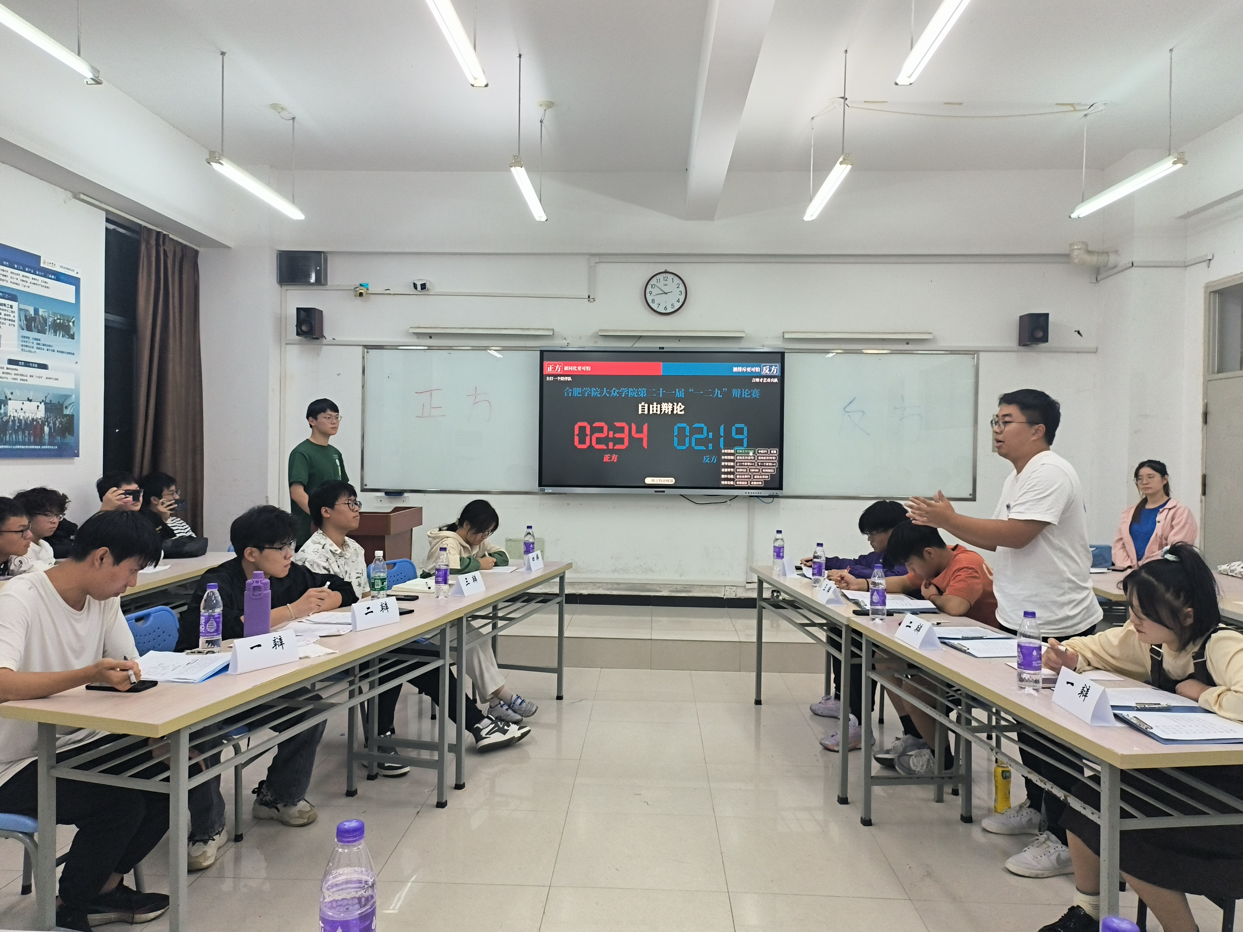 初賽由合肥大學(xué)校辯隊(duì)隊(duì)長(zhǎng)、經(jīng)濟(jì)與管理學(xué)院辯論隊(duì)隊(duì)長(zhǎng)桂欣蕾、經(jīng)濟(jì)與管理學(xué)院辯論隊(duì)副隊(duì)長(zhǎng)毛志煒和先進(jìn)制造與工程學(xué)院資深辯手李威擔(dān)任評(píng)委,蒞臨初賽的有大眾學(xué)院周冉老師。比賽共分為開(kāi)場(chǎng)陳詞、攻辯、攻辯小結(jié)、自由辯論、評(píng)委提問(wèn)、總結(jié)陳詞六個(gè)環(huán)節(jié)。