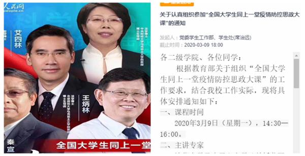 3月9日下午,由教育部社科司、人民網聯合舉辦的“全國大學生同上一堂疫情防控思政大課”在人民網、人民智云、學習大國、咪咕視頻等網絡平臺直播開課。按照教育部、省教育廳通知要求,我校積極組織全體本專科生、碩士研究生準時收看學習。
