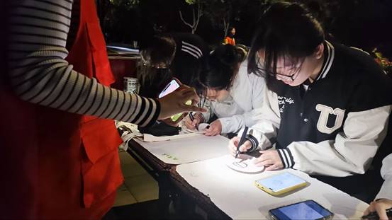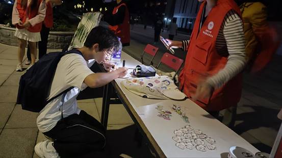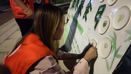 展板活動的現(xiàn)場以“糧食”為主題,參與者需要在紙盤上繪圖或手寫詩句,粘貼在展板上,完成這一系列后即可參與抽獎。路過的同學們踴躍參與本項活動,在紙盤上用心挑選彩筆的顏色勾勒糧食的簡筆畫,或是寫下與糧食有關(guān)的詩句、標語。一幅幅作品,一筆筆勾勒,一句句標語都無一不凝聚著同學們對糧食的敬畏之情,仿佛在訴說著每一粒糧食背后的辛勤耕耘。