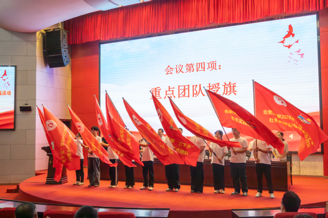 在熱烈的氛圍中,與會領(lǐng)導為18支校級重點團隊授旗,為西部計劃志愿者們頒發(fā)紀念品。