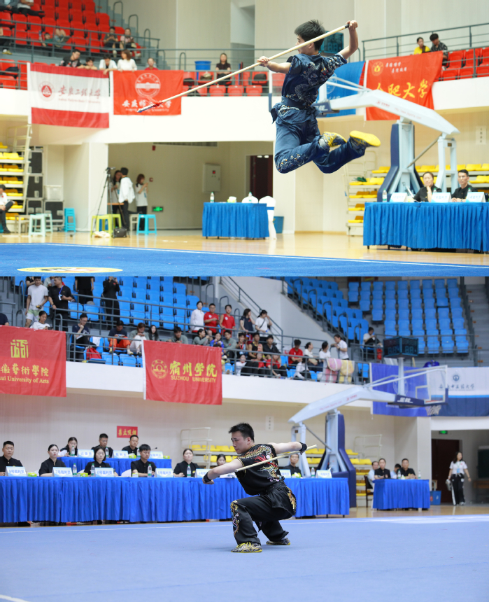 6月18日至23日,2025年安徽省體育聯(lián)賽大學生武術比賽在宿州學院舉行。全省44個代表隊、590名運動員參加比賽,我校武術隊在毛獻亮、徐軍老師的指導下,參加了長拳、南棍、南拳、對練等7個項目的比賽,獲得2金2銀的優(yōu)異成績。其中,孫晨榮獲男子甲組自選南棍冠軍,徐家豪奪得男子甲組自選長拳冠軍,孫晨在男子甲組南拳獲得亞軍,徐家豪、孫晨、王星墨組成的對練隊伍在甲組對練項目中摘得銀牌。
