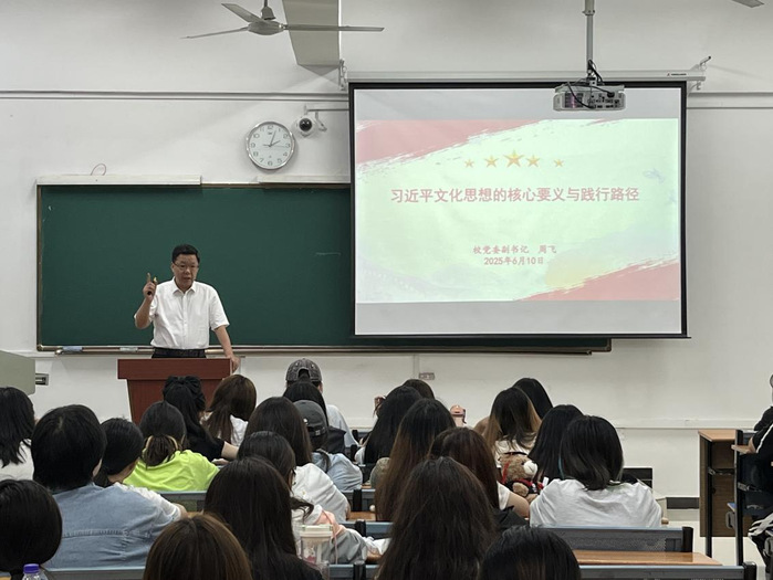 6月10日下午,校黨委副書記周飛以“習近平文化思想的核心要義與踐行路徑”為題,為24級產品設計專業學生授課。他從文化的概念與價值切入,闡釋習近平文化思想的生成邏輯、科學內涵,強調其作為新時代黨領導文化建設實踐經驗的理論總結的重要意義。通過列舉習近平總書記考察歷史文化場館等實例,結合學校文化建設實際,他鼓勵學生堅定文化自信,參與文化傳承創新,從中華優秀傳統文化中汲取養分,講好中國故事。