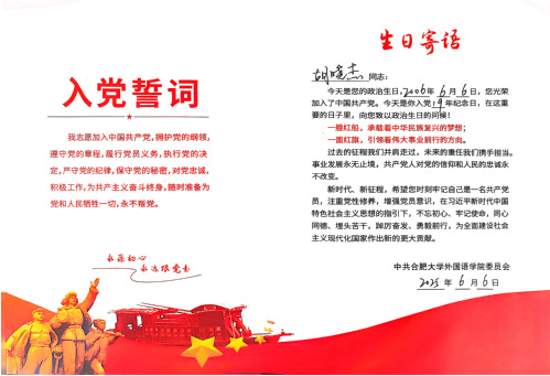 一人過生日,集體受教育。6月24日,外國語學院為入黨時間在6至7月的師生黨員過集體“政治生日”。院黨委書記吳孔寶為2位教師黨員和14位學生黨員送上“政治生日”賀卡,幫黨員佩戴黨員徽章,并開展談心談話,引導黨員堅定信仰、嚴守紀律、永葆初心、砥礪前行。