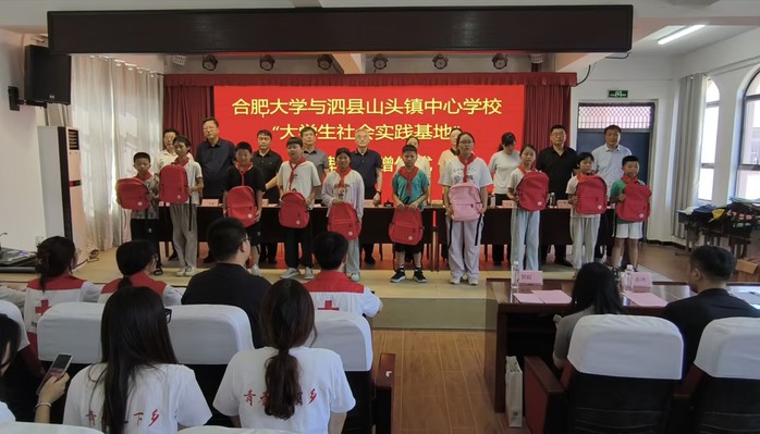 7月3日上午,鄔平川一行赴泗縣山頭鎮中心學校,看望慰問我校暑期“三下鄉”社會實踐團隊師生,出席校團委捐贈儀式暨“合肥大學生社會實踐基地”授牌活動。鄔平川對實踐團隊提出殷切期望,勉勵同學們珍惜深入基層的機會,在服務中了解國情民情,錘煉本領;鼓勵當地學生勤奮學習、成長成才,未來報效祖國。他強調,合肥大學將充分發揮高校智力資源優勢,持續支持泗縣社會經濟教育等事業發展。