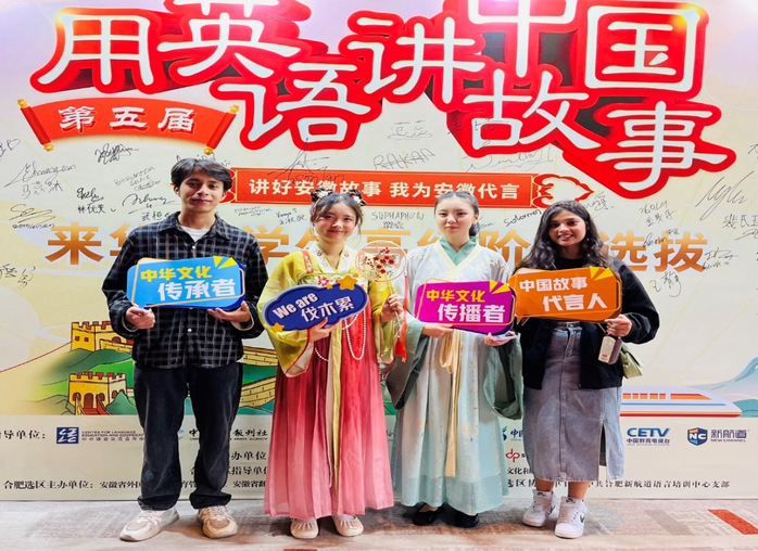 本屆大會以“講好安徽故事,我為安徽代言”為主題,活動分為主題演講、即興問答和才藝展示三個環節。我校選派胡京晶(蒙古)、張北星(泰國)、蘇蓓夏(尼泊爾)、羅深(尼泊爾)進入高階選拔,組織專業師資力量對參賽學生進行一對一指導。選手們通過聲情并茂的舞臺表現,表達了他們對中國傳統文化的熱愛。