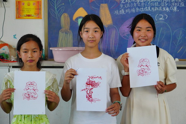 為進一步講好中國故事,推廣中華優(yōu)秀傳統(tǒng)文化,志愿者們依托挑戰(zhàn)杯省賽獲獎項目,以“朱砂拓福” 為主題講述年畫的歷史淵源與文化寓意。孩子們親手體驗拓印工藝,感受傳統(tǒng)藝術(shù)的博大精深。朗誦課上,志愿者們以毛澤東詩詞《沁園春·長沙》為主要教學內(nèi)容,從字詞解析到情感把握展開系統(tǒng)性的指導。繪畫課與手工課上孩子們盡情創(chuàng)作,一幅幅充滿童趣的圖案,一件件獨具匠心的作品,既保留了傳統(tǒng)文化的吉祥寓意,又融入了孩子們的奇思妙想。