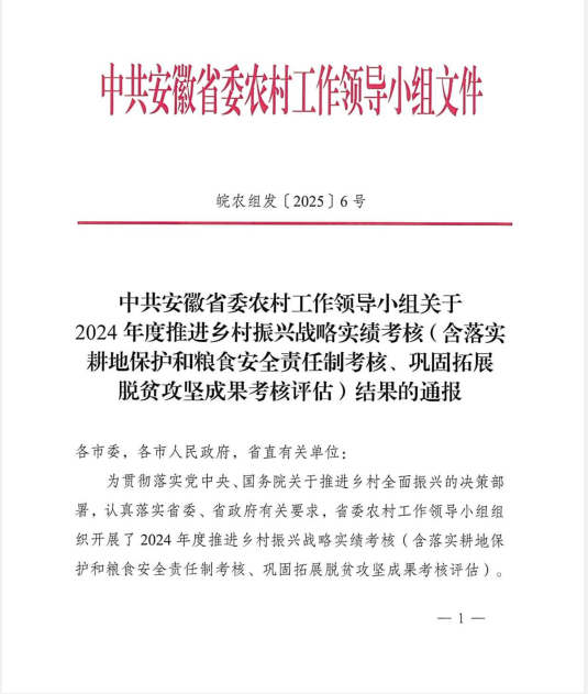 近日,中共安徽省委農(nóng)村工作領(lǐng)導(dǎo)小組印發(fā)《關(guān)于2024年度推進(jìn)鄉(xiāng)村振興戰(zhàn)略實(shí)績(jī)考核(含落實(shí)耕地保護(hù)和糧食安全責(zé)任制考核、鞏固拓展脫貧攻堅(jiān)成果考核評(píng)估)結(jié)果的通報(bào)》(皖農(nóng)組發(fā)〔2025〕6號(hào)),合肥大學(xué)定點(diǎn)幫扶泗縣工作被評(píng)定為“優(yōu)秀”等次,這也是開(kāi)展相關(guān)考核工作以來(lái),我校連續(xù)第八次獲得此成績(jī)。