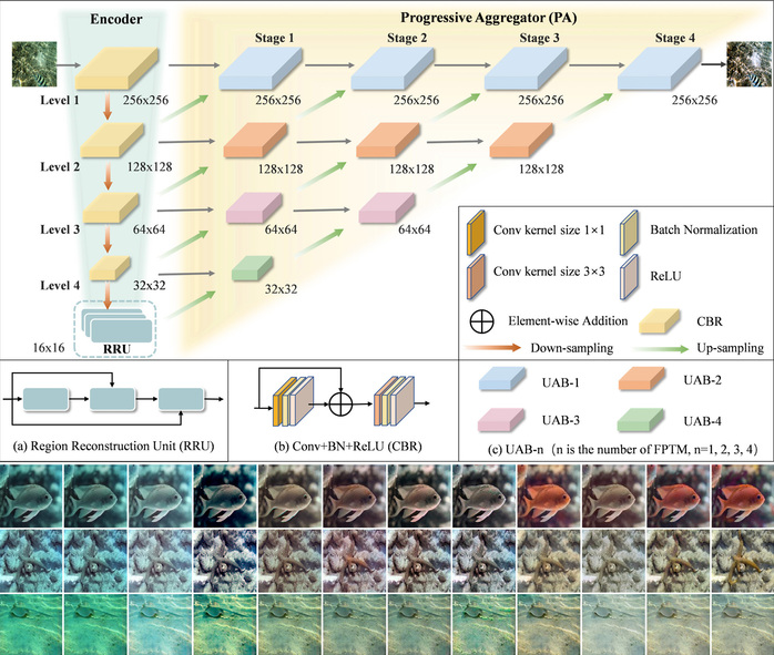 在水下圖像增強方向,研究團隊提出一種融合特征提示Transformer的漸進式聚合增強方法。該方法創新性地融合了特征注意力機制與提示權重調節輸入特征,實現了特征高效傳遞與多尺度漸進式聚合,可以全面捕捉圖像細節與語義信息以有效增強水下降質圖像。該方法展現出優異的學習與泛化能力,且能為下游視覺任務帶來顯著性能增益。楊靜博士為第一作者和通訊作者,合肥大學人工智能與大數據學院為第一完成單位。(論文標題:PAFPT: Progressive aggregator with feature prompted transformer for underwater image enhancement,引用鏈接:https://www.sciencedirect.com/science/article/pii/S0957417424024060)