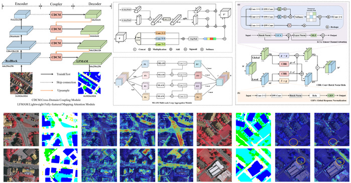 在復雜場景遙感語義分割方向,團隊提出輕量級跨域耦合網絡(LCCN)。該網絡創新性采用“Encoder-Coupler-Decoder”架構,耦合器中通過跨域耦合模塊實現多尺度特征提取與全局信息建模,解碼器中借助輕量級全特征映射注意力模塊捕捉多維度特征交互,優化復雜場景下的語義分割效果。王曉峰教授為第一作者,陳巖博士為通訊作者,合肥大學人工智能與大數據學院為第一完成單位。(論文標題:Cross-Domain Coupling Network With Lightweight Fully Featured Mapping and Loop Aggregation for Semantic Segmentation of High-Resolution Remote Sensing Images,引用鏈接:https://ieeexplore.ieee.org/document/11129080)