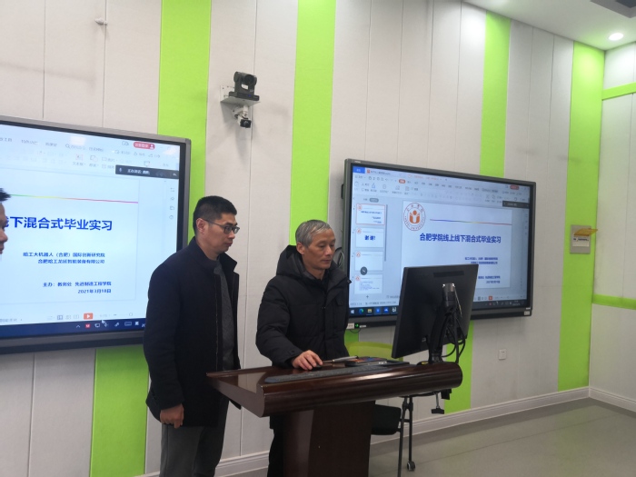 活動期間,教務處孔春華老師在現場協調兩地直播進度及模式切換,教務處徐厚昌老師、先進制造工程學院馮敏亮老師分別在學校現場、企業現場擔任直播主持。學校活動現場設在合肥學院多媒體智慧教室35棟305室,共有42名機械電子工程、機械設計制造及其自動化等相關專業學生參加,多位老師在場協調安排;企業活動現場設在哈工大機器人(合肥)研究院、合肥哈工龍延智能裝備有限公司等地,部分實習學生、指導老師、企業導師等在現場,通過專業攝像設備進行實況直播。網絡媒介將學校現場與企業現場連接,形成實時互動,達到線上線下混合式實時結合。
