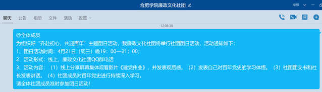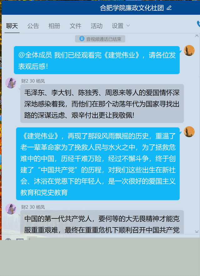 此次團(tuán)日活動(dòng)主要以主題會(huì)議的形式展開(kāi)。當(dāng)天晚上七點(diǎn),參與活動(dòng)的同學(xué)們?cè)缫烟崆斑M(jìn)入QQ群語(yǔ)音。會(huì)議伊始,社團(tuán)團(tuán)支書(shū)李致遠(yuǎn)發(fā)言,向大家介紹此次團(tuán)日活動(dòng)的主要內(nèi)容和開(kāi)展的重要性。隨后便是集體觀看電影《建黨偉業(yè)》精選片段,通過(guò)觀看電影,感受了革命先輩崇高的信仰,進(jìn)一步加深了社員們對(duì)黨的歷史和黨的路線、方針、政策的認(rèn)識(shí),同時(shí)也營(yíng)造出濃厚的愛(ài)國(guó)主義教育與氛圍,激發(fā)了社員們學(xué)習(xí)和發(fā)揚(yáng)革命先輩艱苦奮斗、無(wú)私奉獻(xiàn)的革命精神。緊接著,團(tuán)支書(shū)帶動(dòng)大家一起發(fā)表觀后感,并討論自己對(duì)百年黨史的學(xué)習(xí)感悟,同學(xué)們紛紛被打動(dòng),更加踴躍發(fā)言。最后,團(tuán)支書(shū)和社長(zhǎng)發(fā)言,就此次活動(dòng)做了簡(jiǎn)單總結(jié),激勵(lì)社團(tuán)成員對(duì)百年黨史進(jìn)行持續(xù)深入學(xué)習(xí),不忘初心。