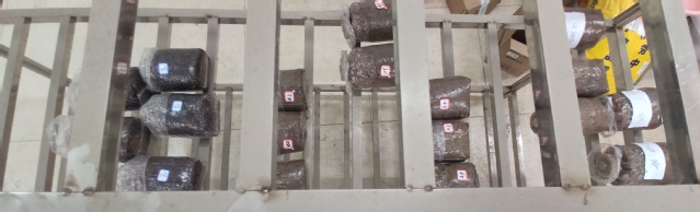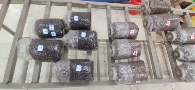 在閱讀大量文獻(xiàn)后,第一組成員基本確定了培養(yǎng)基的配方,一組為80%的木屑,18%的棉籽殼,1%的石膏和1%的葡萄糖,另外一組為60%的木屑, 20%的麥麩, 18%的棉籽殼,1%的石膏,1%的葡萄糖。在確定好培養(yǎng)基成分后,小組成員開(kāi)始拌料,裝袋,包扎,滅菌,接種。第二組同學(xué)一致認(rèn)為,接種位置按上中下分為三組比較合理,并且按照60%的木屑, 20%的麥麩, 18%的棉籽殼,1%的石膏,1%的葡萄糖準(zhǔn)備好培養(yǎng)基,開(kāi)始拌料,裝袋,包扎,滅菌,接種。