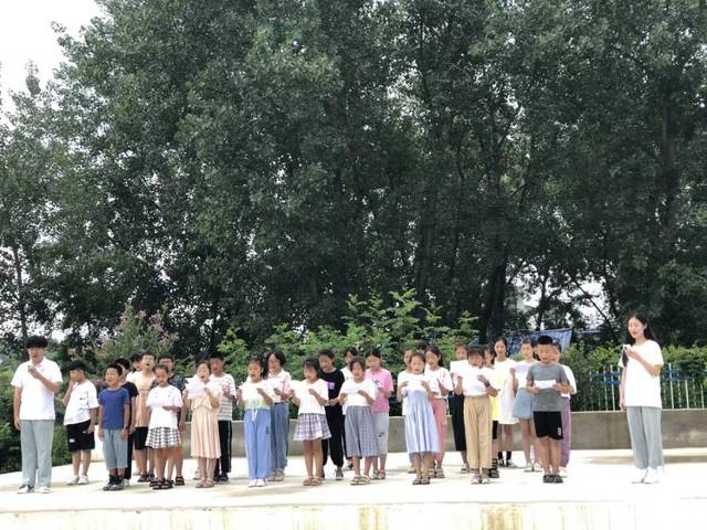 早上7:00,志愿團隊到達(dá)丁集鎮(zhèn)中心小學(xué),在操場上為7月19日的文藝匯演進行彩排。結(jié)束后,志愿者們在規(guī)定時間內(nèi)吃完早飯。