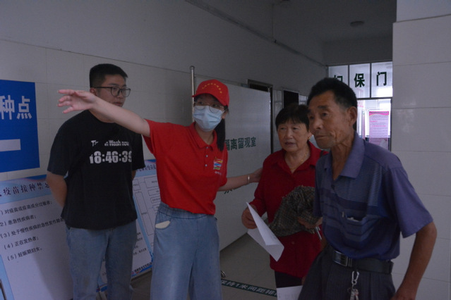 到達(dá)柿樹崗鄉(xiāng)之后,調(diào)研團(tuán)隊面對蚊蟲叮咬、天氣炎熱和較為艱苦的住宿環(huán)境沒有表現(xiàn)出畏難情緒,而是即刻參與到當(dāng)?shù)蒯t(yī)療衛(wèi)生工作之中。大家前往當(dāng)?shù)匦l(wèi)生院,協(xié)助醫(yī)護(hù)人員完成疫苗接種工作,幫助維護(hù)現(xiàn)場秩序,同時也為當(dāng)?shù)厝嗣衿占盎A(chǔ)醫(yī)療知識,解答關(guān)于疫苗接種問題,消除未接種居民心中的疑惑與擔(dān)憂。