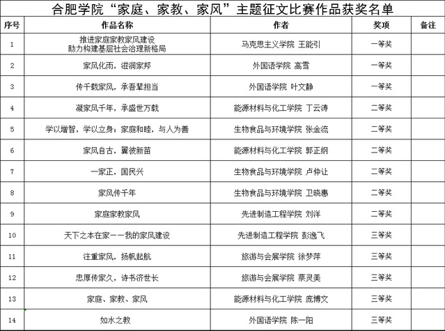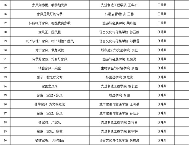 經過二級學院和各部門廣泛動員、宣傳,我校師生踴躍報名,共收到征文30篇,他們圍繞主題,立足家庭,貼近實際,放眼社會,以文字生動詮釋了中華民族傳統家庭美德。經校外專家評比打分,評選出一二三等獎和優秀獎若干,其中,馬克思主義學院王能引等3人獲一等獎,能源材料與化工學院丁云濤等6人獲二等獎,先進制造工程學院彭逸飛等8人獲三等獎。