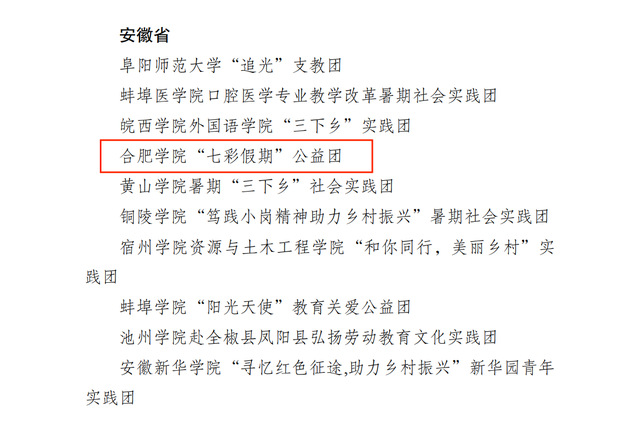 2021年暑期,由合肥學(xué)院學(xué)生會、南艷青年新媒體中心以及學(xué)生社團管理辦公室聯(lián)合組建一支支教隊伍赴廬江縣凌安村,他們走基層、辦實事,開展了為期10天的點燃假期星火夢。這是一支由1位老師和20名學(xué)生組成的隊伍,在短短的十天內(nèi),用自身的創(chuàng)造力,想象力,結(jié)合自身經(jīng)歷,將文化,科技,衛(wèi)生相關(guān)知識融入到多姿多彩的課堂里,點燃小朋友們的假期夢,豐富其精神文化生活。