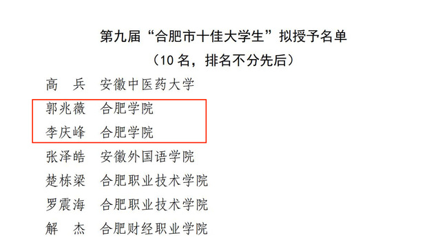 近日,由合肥市教育局、共青團合肥市委員會、合肥市學生聯合會共同舉辦的尋訪2021年度“合肥市最美學生”暨第九屆“合肥市十佳學生”評選活動結果公布,我校學子獲郭兆薇、李慶鋒獲“合肥市十佳大學生”榮譽稱號,鄒夢婷、楊成曉獲“合肥市最美大學生”榮譽稱號。