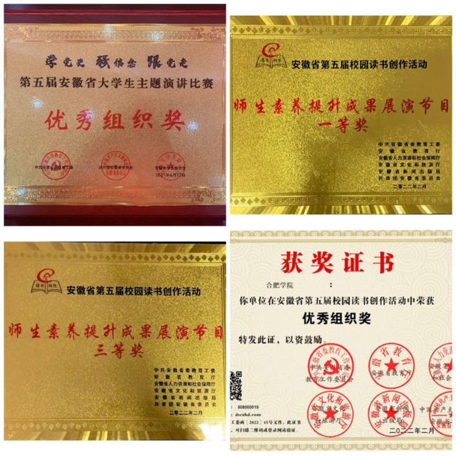 在讀書創(chuàng)作活動中,王欣悅同學(xué)被評為“讀書創(chuàng)作之星”,她的作品《漫山遍野映山紅》獲特等獎;在“謳歌百年輝煌歷程”文藝短視頻比賽中,李慶鋒同學(xué)的沙畫《百年輝煌歷程》獲得一等獎;在第五屆安徽省大學(xué)生主題演講比賽中,張遠想同學(xué)獲得本科組一等獎(第二名);在第三屆中華經(jīng)典誦寫講大賽安徽省預(yù)選賽中,張昊、張佳駱、張瀚程等同學(xué)的作品《月光下的中國》獲一等獎。魯世秀、毛紅星、丁婧等五位老師獲評“優(yōu)秀指導(dǎo)老師”,我校分別獲得第五屆安徽省大學(xué)生主題演講比賽、第三屆中華經(jīng)典誦寫講大賽安徽省預(yù)選賽和讀書創(chuàng)作活動三個比賽的優(yōu)秀組織獎。眾多獎項的獲得是我校校園文化建設(shè)的優(yōu)秀成果之一,體現(xiàn)了我校師生優(yōu)秀的人文素養(yǎng)和綜合素質(zhì)。