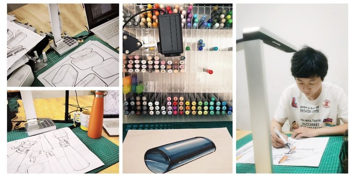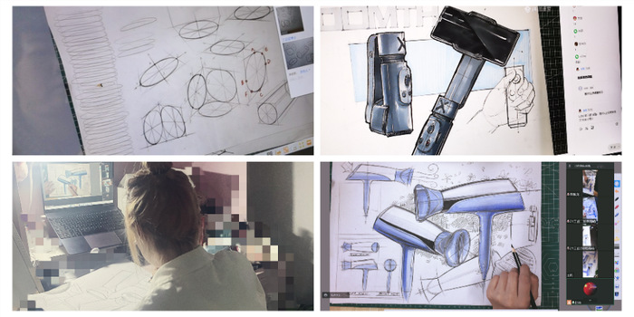 《手繪產(chǎn)品效果圖》是工業(yè)設(shè)計(jì)、產(chǎn)品設(shè)計(jì)專(zhuān)業(yè)重要的實(shí)踐類(lèi)專(zhuān)業(yè)基礎(chǔ)課,講究的是“真操實(shí)干”。“由于設(shè)計(jì)專(zhuān)業(yè)的特殊性,大多學(xué)生的手繪基礎(chǔ)薄弱,為了保證教學(xué)質(zhì)量,所以我們的手繪實(shí)踐課即使是在線(xiàn)上進(jìn)行也要讓學(xué)生們真正動(dòng)起手。”設(shè)計(jì)學(xué)院的孫嵐老師說(shuō)道。為了達(dá)到實(shí)質(zhì)等效的線(xiàn)上教學(xué)效果,孫老師創(chuàng)新教學(xué)手段和教學(xué)方法,借助騰訊會(huì)議和QQ兩個(gè)平臺(tái),搭建了“電腦+實(shí)物投影儀+錄播燈”的簡(jiǎn)易錄播室。線(xiàn)上教學(xué)時(shí),孫老師的示范講解實(shí)時(shí)反映在學(xué)生的屏幕上,學(xué)生可以跟著老師邊學(xué)邊練。