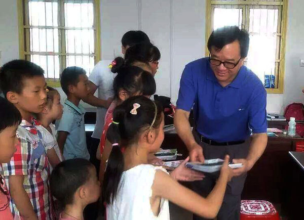 丁明為經濟系支教的小學生發放贈送的文具用品