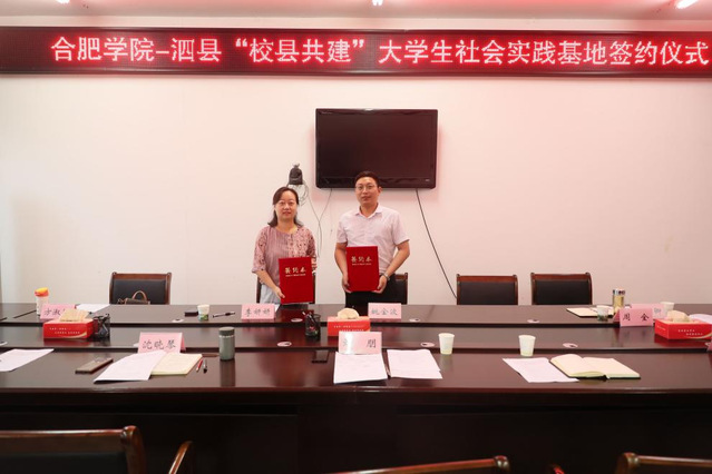 7月6日下午,合肥學院—泗縣“校縣共建”大學生社會實踐基地簽約儀式在泗縣縣委組織部會議室舉行。泗縣縣委常委、組織部部長、統戰部部長劉朋、縣委組織部副部長沈曉琴、團泗縣縣委書記姚金波等領導及我校黨委組織部正處級組織員周全、外國語學院黨委書記吳孔寶、團委副書記李妍妍、副處級組織員張海卿等領導及代表出席會議,會議由劉朋主持。
