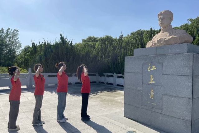 為追尋歷史記憶,汲取紅色精神力量,團隊成員跟隨村黨總支書記惠朋和駐村第一書記周全一同參觀了江上青烈士陵園。黨員代表們面對一尊半身雕像,高舉右手莊嚴宣誓:“我志愿加入中國共產黨……隨時準備為黨和人民犧牲一切,永不叛黨。”鏗鏘恢弘的誓詞,一字一句,神圣而豪邁,紅色精神深入人心。