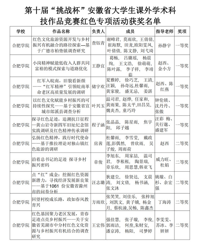 在校賽階段,共計收集作品29件,經校內評選,最終推薦12件參加省賽。其中《紅色文化旅游資源開發(fā)與鄉(xiāng)村振興有機融合的路徑探索—基于廣德市柏墊鎮(zhèn)調查研究》《小崗精神賦能低收入人群共同富裕的模式探索與道路優(yōu)化》《紅軍入皖南,舊貌看新顏——“紅軍精神”引領皖南革命老區(qū)高質量發(fā)展的調研》《以紅色文化賦能鄉(xiāng)村振興的可持續(xù)性探究——基于安徽省宣城市郎溪縣調查分析》《探尋紅色足跡,追溯抗日征程——黃山巖寺新四軍舊址紀念館實踐調研及紅色精神傳承調研》5件作品榮獲省級一等獎。