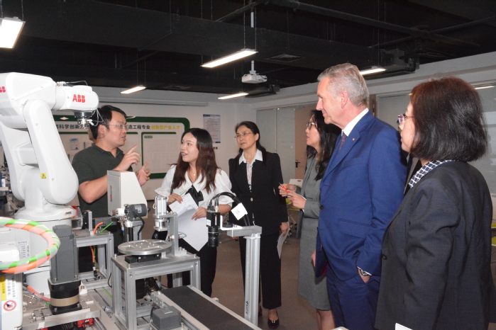 武爾夫一行還參觀了大眾學院校企實訓平臺,在多模態設備健康評估實驗室、智能制造系統集成技術應用及創新中心、數字孿生技術及工程應用中心調研了學科建設、模塊化課程、實訓教學等情況,高度肯定了我校“地方性、應用型、國際化”的辦學定位。