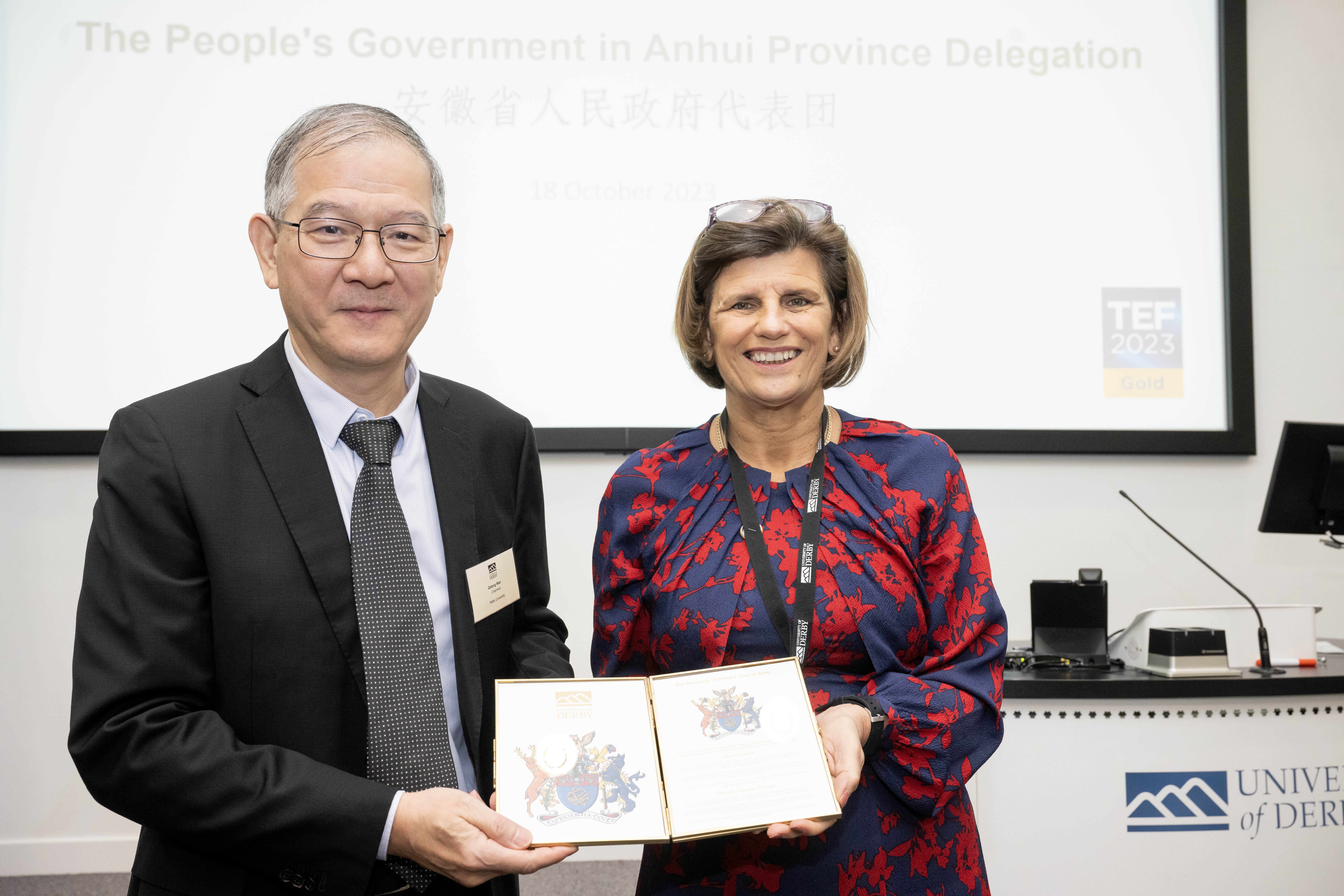 10月18日,在王清憲省長、中國駐曼徹斯特領(lǐng)事館總領(lǐng)事唐銳、英國德比郡議長代表托尼·金(Tony King)及安徽省政府代表團的見證下,王其東代表學校與德比大學校長凱西·米切爾(Kathryn Mitchell)簽署了校際合作框架協(xié)議,開展師生互訪、學生培養(yǎng)、科研合作等。