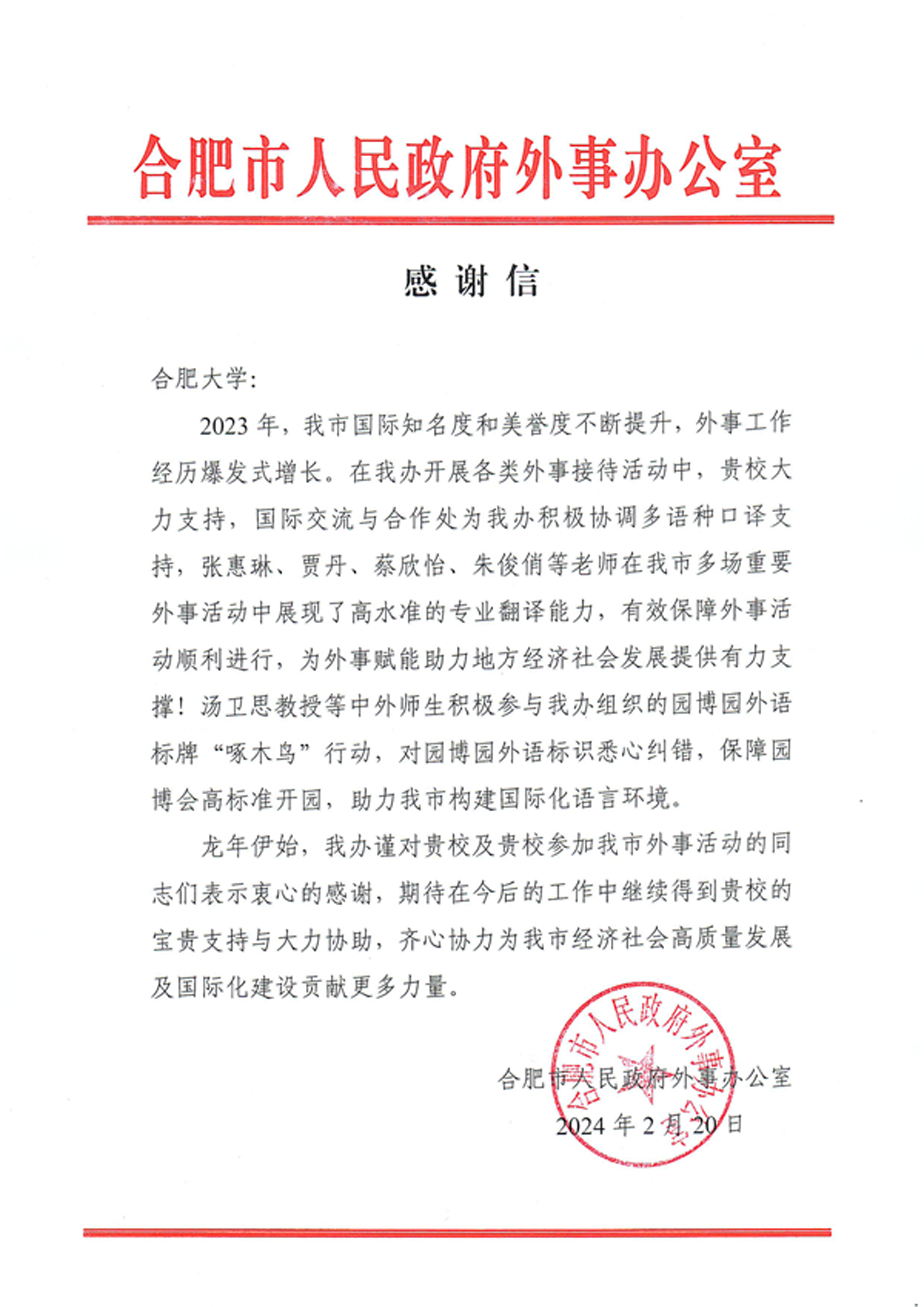 近日,安徽省人民政府外事辦公室、合肥市人民政府外事辦公室分別向合肥大學發來感謝信,充分肯定我校在