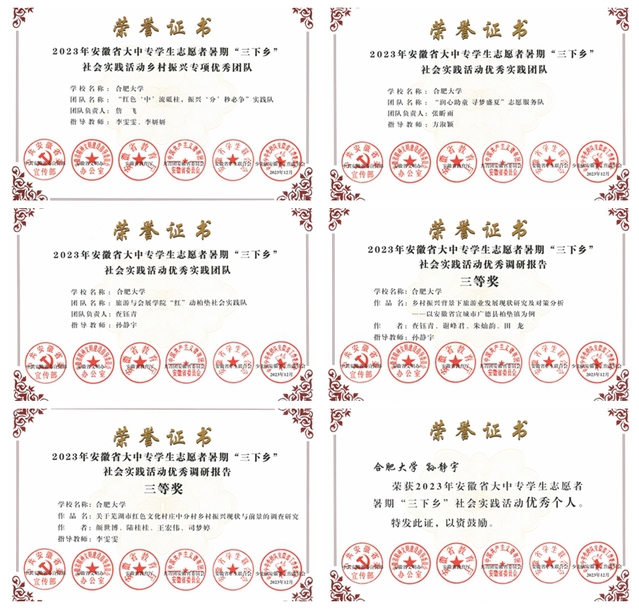 2023年12月,團中央、團省委分別對2023年大中專學生志愿者暑期文化科技衛生“三下鄉”社會實踐活動中表現突出的優秀集體、個人和項目進行了表彰。我校喜獲1項國家級、7項省級榮譽,部分證書于近日發放。