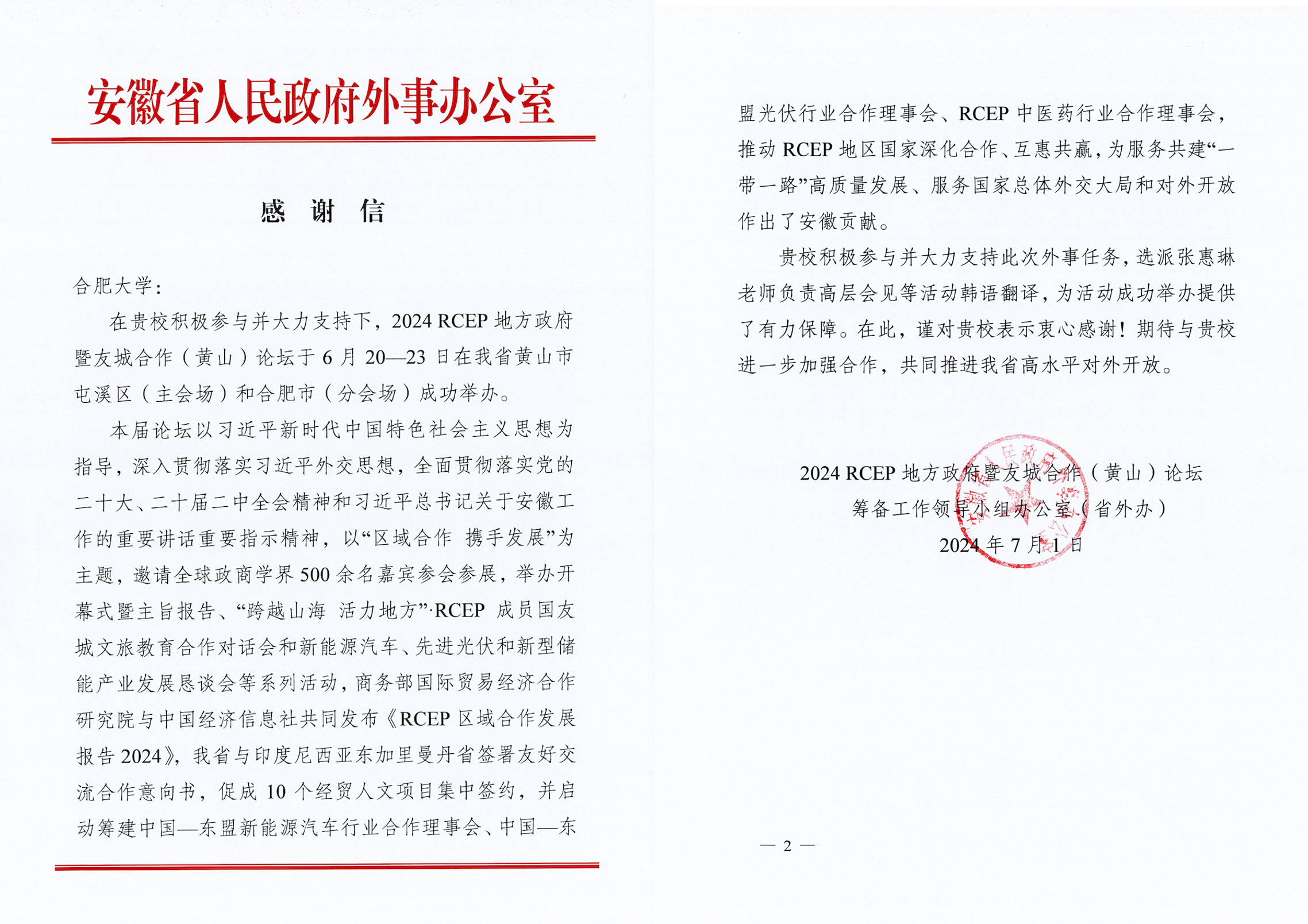 日前,安徽省人民政府外事辦公室向我校發(fā)來感謝信,充分肯定我校為“2024RCEP地方政府暨友城合作(黃山)論壇”成功舉辦所做出的積極貢獻。