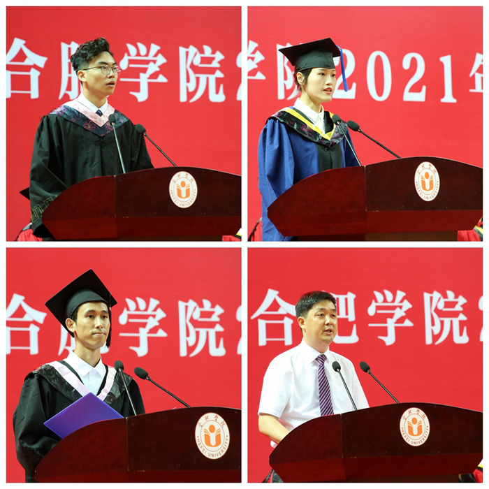 本科生畢業生代表周雷、研究生畢業生代表陸冰潔、留學生代表鄧子明、教師代表楊慶國教授相繼發言。周雷回顧了大學四年的收獲與成長,他表示,會堅定不移聽黨話、跟黨走,增強志氣、骨氣、底氣,不負時代,不負韶華,不負黨和人民的殷切期望,牢記“厚德博學、善思致用”的校訓,在祖國最需要的地方發光發熱。陸冰潔對學校和老師的悉心培養表達了真誠的感謝,她說道:“畢業不是學習的終點,而是新征程的起點,我將會繼續努力,為母校爭光,為社會添彩。”鄧子明在發言中對中國“一帶一路”建設和合肥學院的國際教育合作為他提供求學機會,以及學校、老師和同學對他的關懷幫助表示衷心的感謝。在合肥學院,他收獲了青春記憶,獲得了前進動力。楊慶國在發言中勉勵畢業生永存至真至義、當立鴻鵠之志、再續輝煌征程。他提到:“士不可以不弘毅,任重而道遠,希望同學們志存高遠,為了‘躺贏’,絕不‘躺平’。”