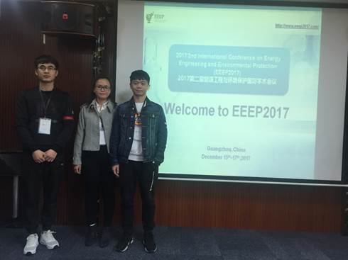 20171215日至17,我校2016級研究生潘暢、周仲愷在趙歡老師的帶領下參加了在廣州舉辦的2017第二屆能源工程與環境保護國際學術會議(EEEP2017),會議期間與來自各國的專家學者和其他參會人員圍繞環境保護和能源節約等主題進行了匯報和討論。參會人員分別介紹了各自領域的研究方向和成果,并展開了積極的交流。會議期間潘暢做了題為《Heavy Metal Contaminated Soil imitation biological treatment Overview》的匯報,介紹了我國目前重金屬污染的概況、應對措施以及治理方法的新方向,重點介紹了生物修復技術。